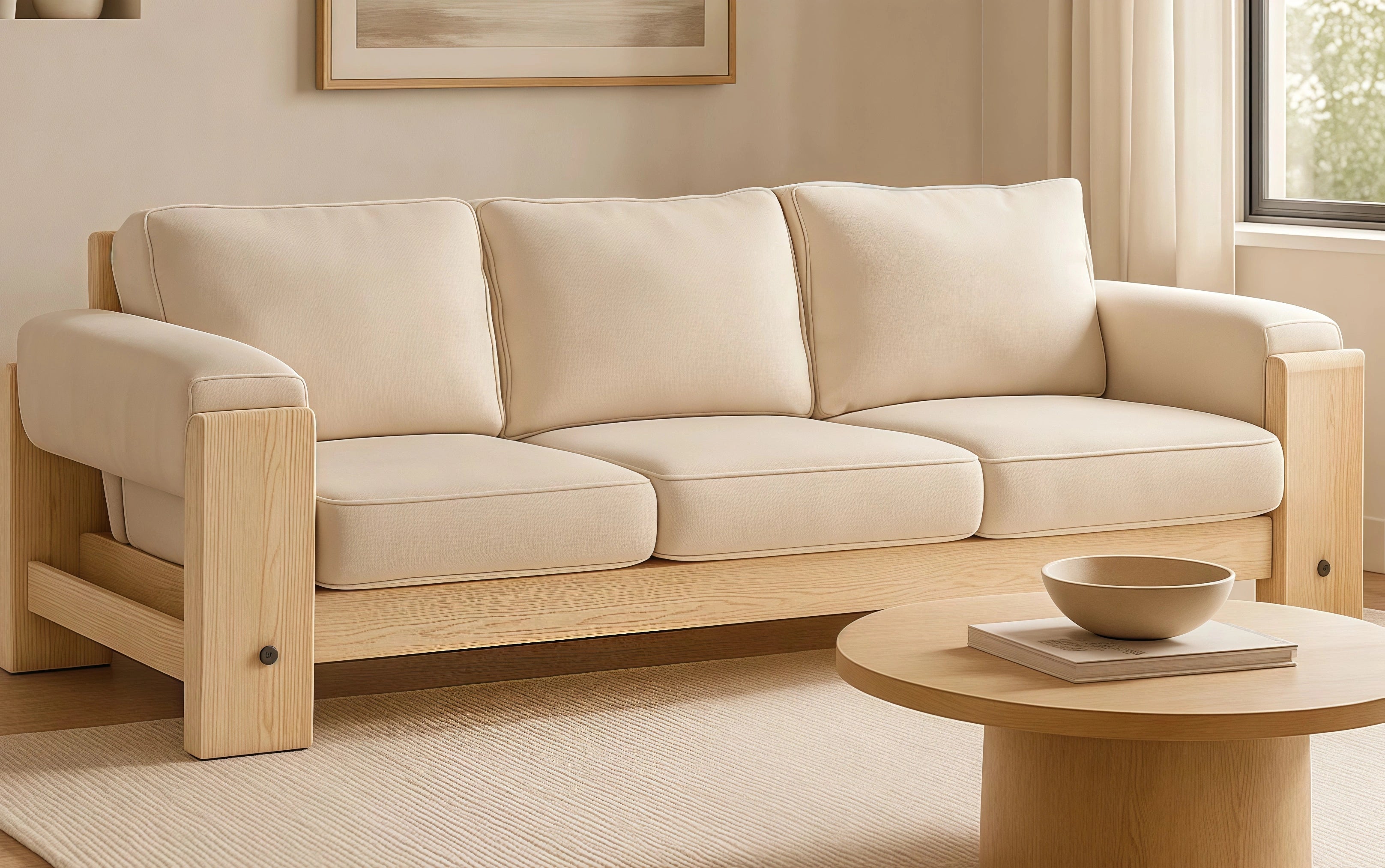 Sofá de Tres Plazas en Tela Beige con Patas de Madera
