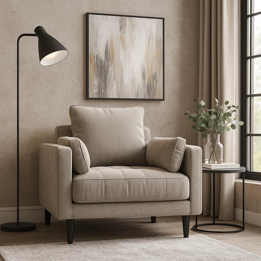Sillón Individual Moderno en Tela Gris con Patas de Madera Negra