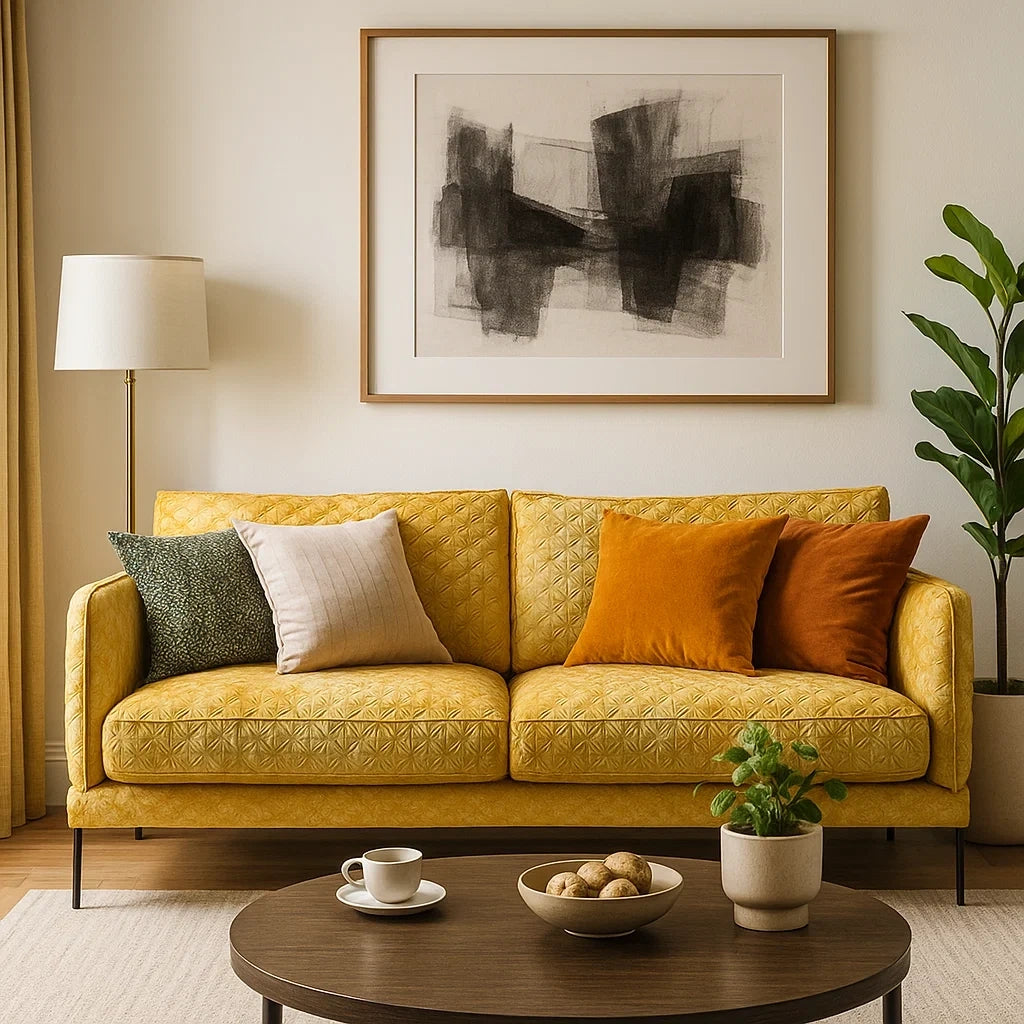 Sofá Acolchado Amarillo de 3 Plazas con Cojines Decorativos