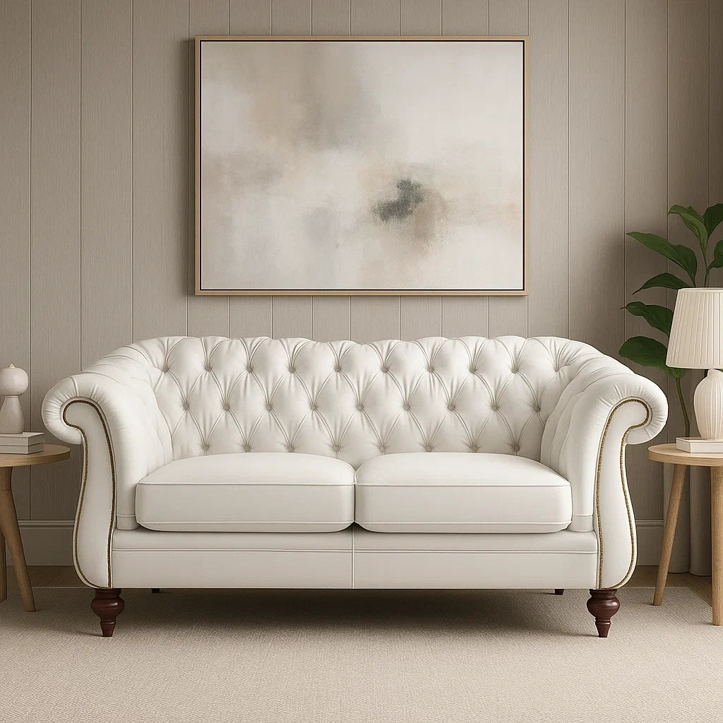 Sofá Chesterfield de 2 Plazas en Piel Blanca con Patas de Madera