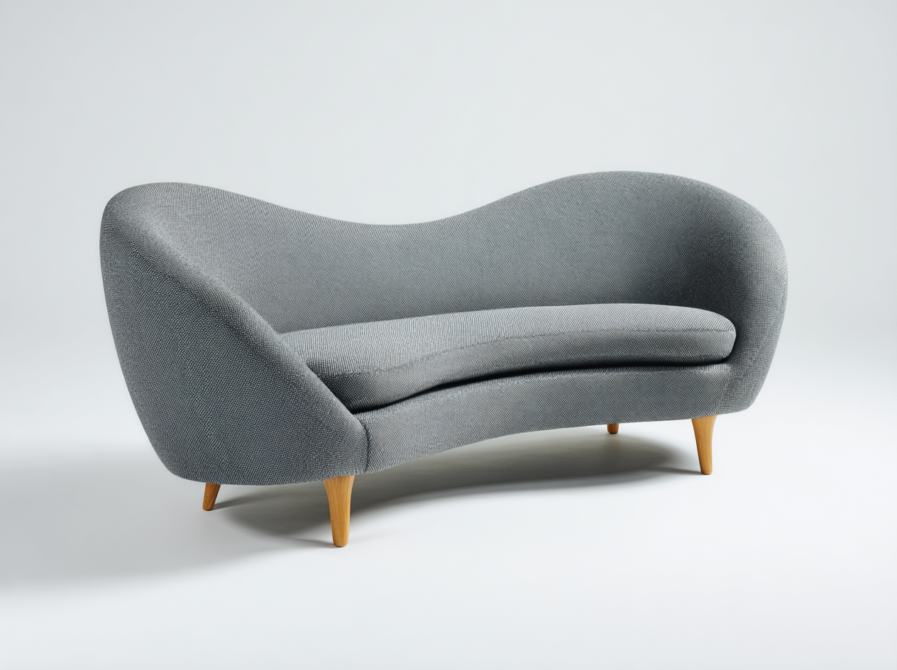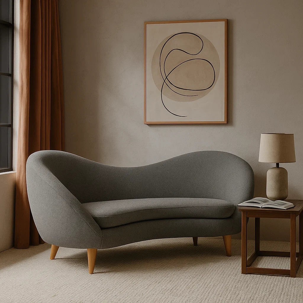 Sofá Curvo de 3 Plazas en Tela Gris con Patas de Madera