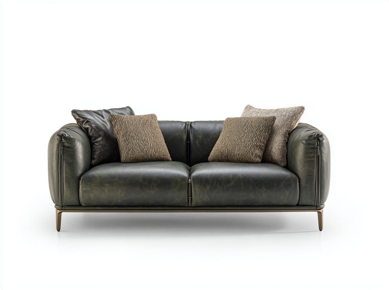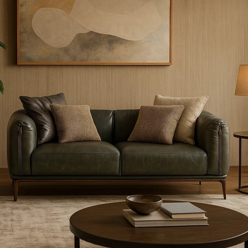 Sofá de 2 Plazas en Cuero Verde Oscuro con Cojines Decorativos