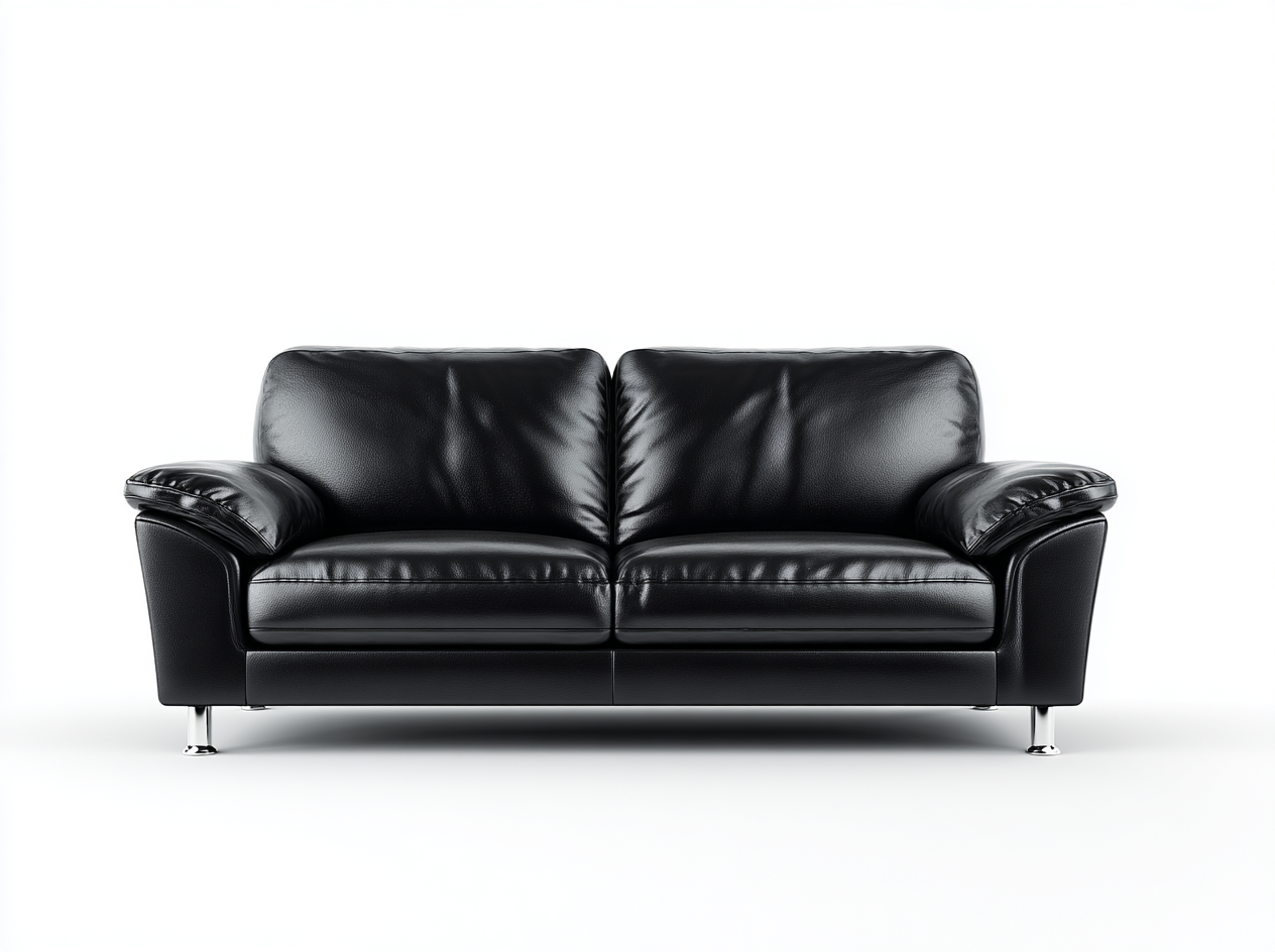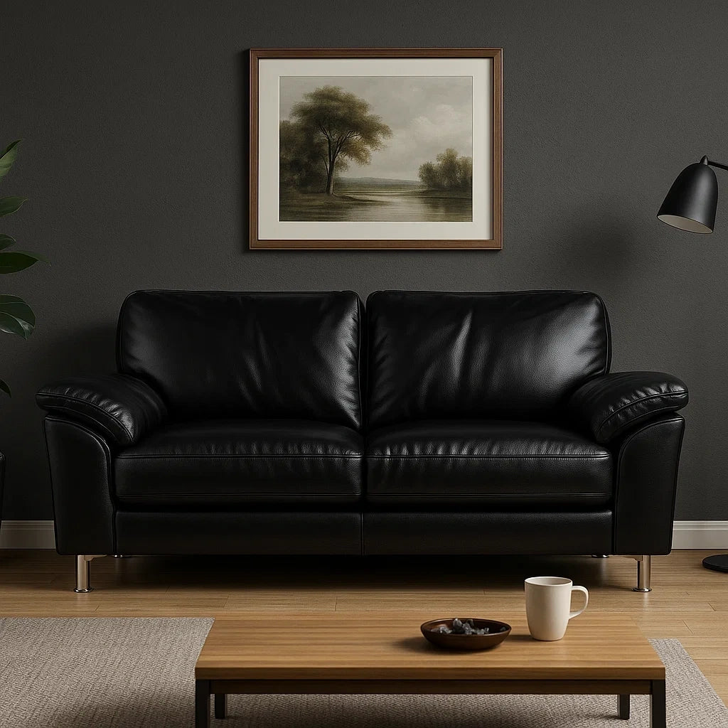 Sofá de 2 plazas en piel auténtica negra con patas cromadas modernas