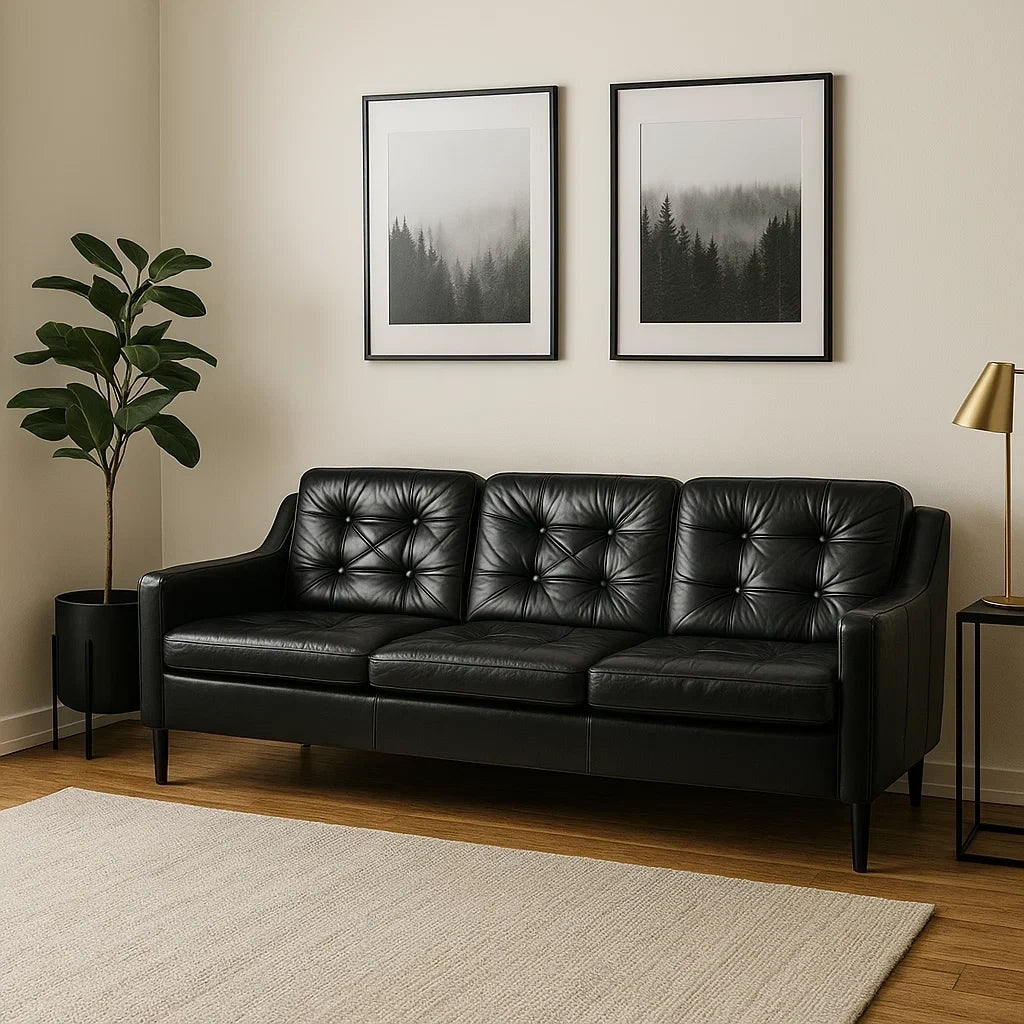 Sofá de 3 Plazas en Cuero Negro con Respaldo Acolchado y Estilo Moderno