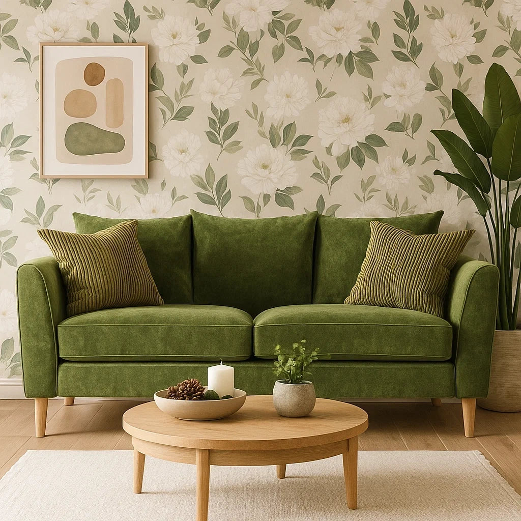 Sofá de Dos Plazas en Terciopelo Verde con Cojines Decorativos y Estilo Moderno