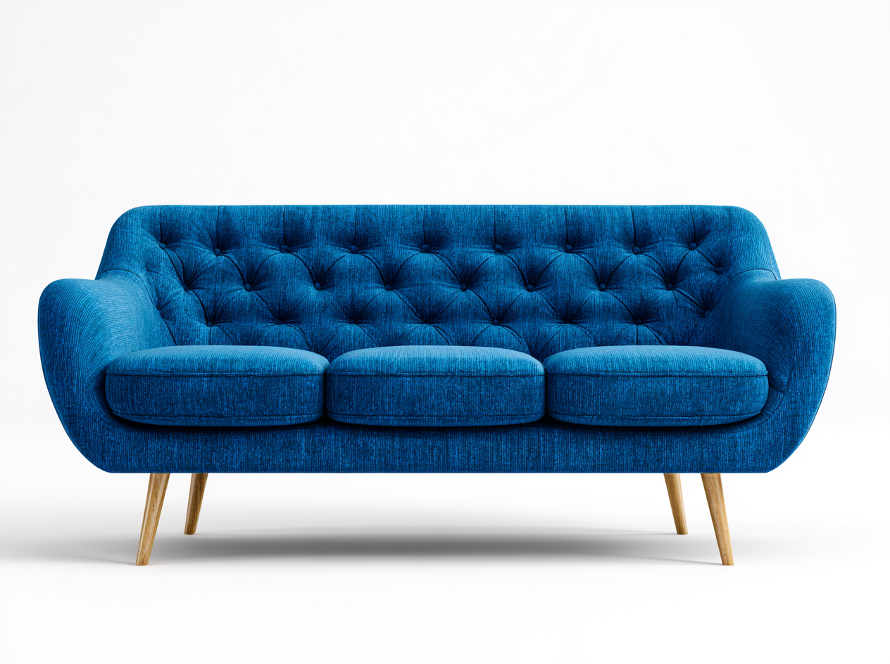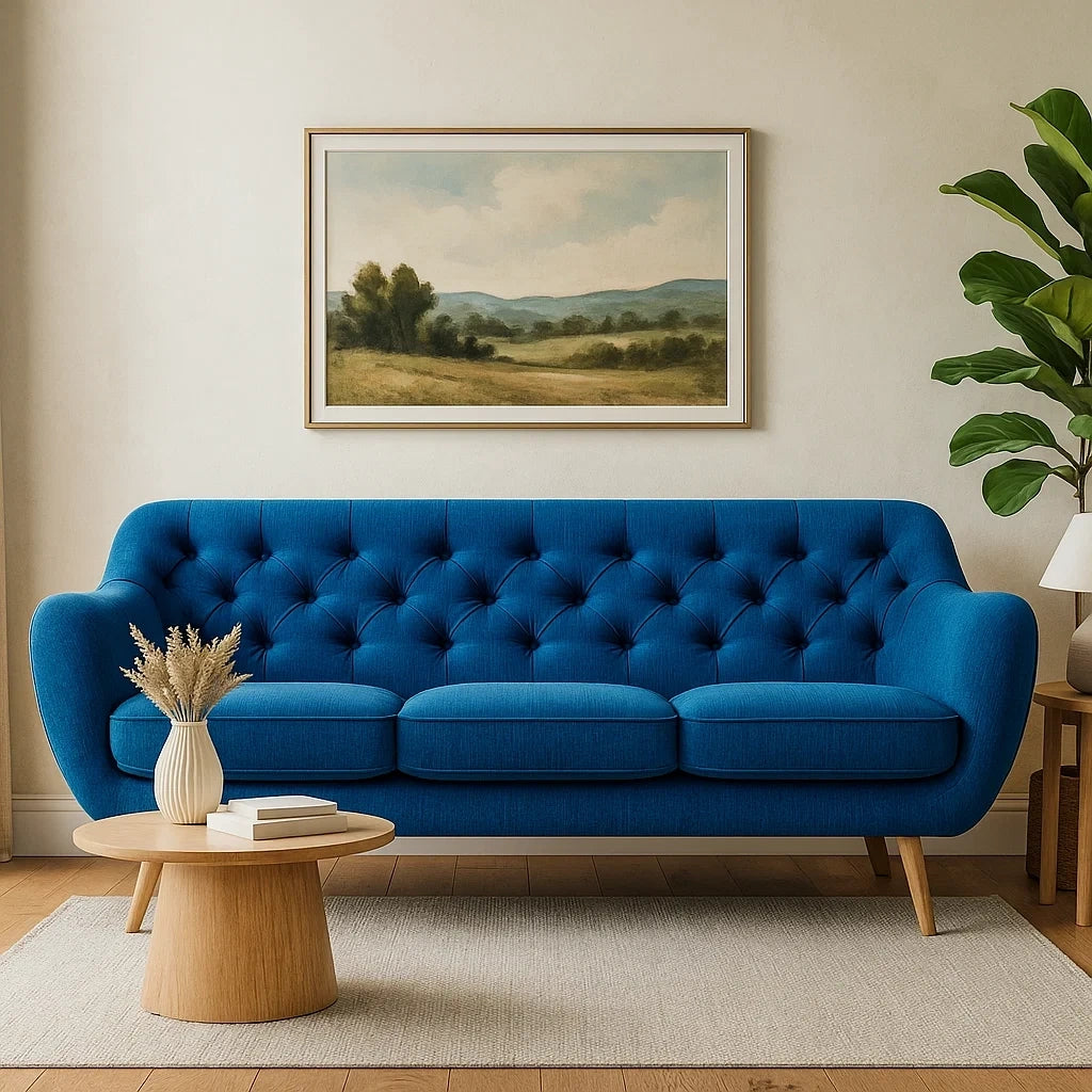 Sofá de Tres Plazas en Tela Azul con Respaldo Acolchado y Patas de Madera