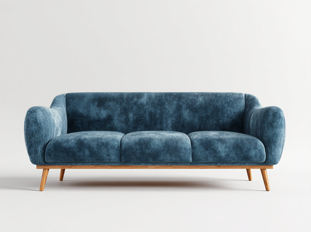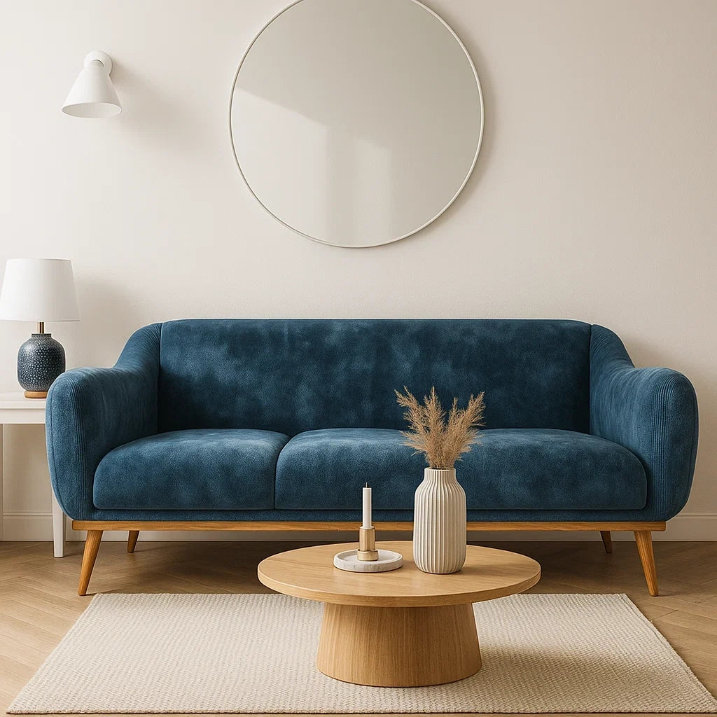 Sofá de Tres Plazas en Tela Azul Terciopelo con Patas de Madera Maciza
