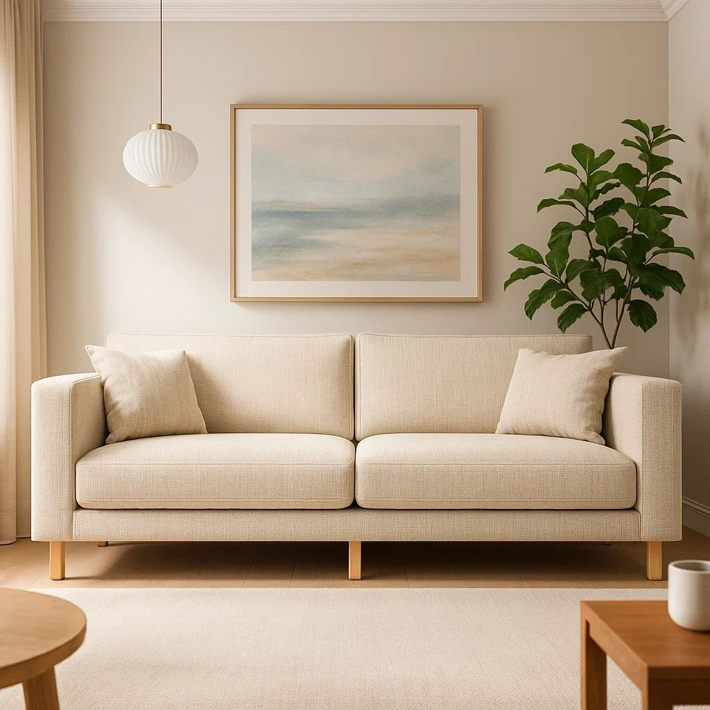 Sofá de Tres Plazas en Tela Beige con Patas de Madera