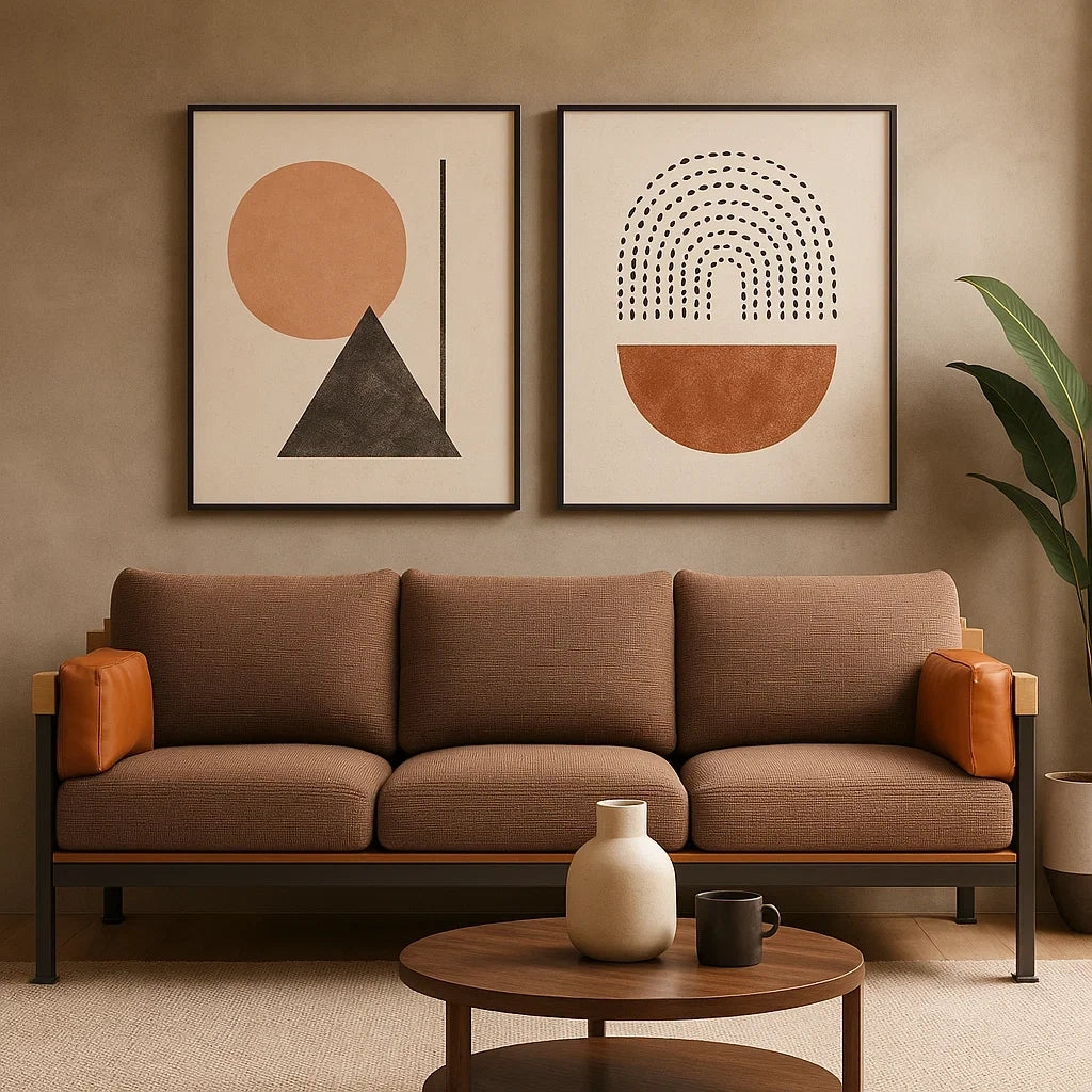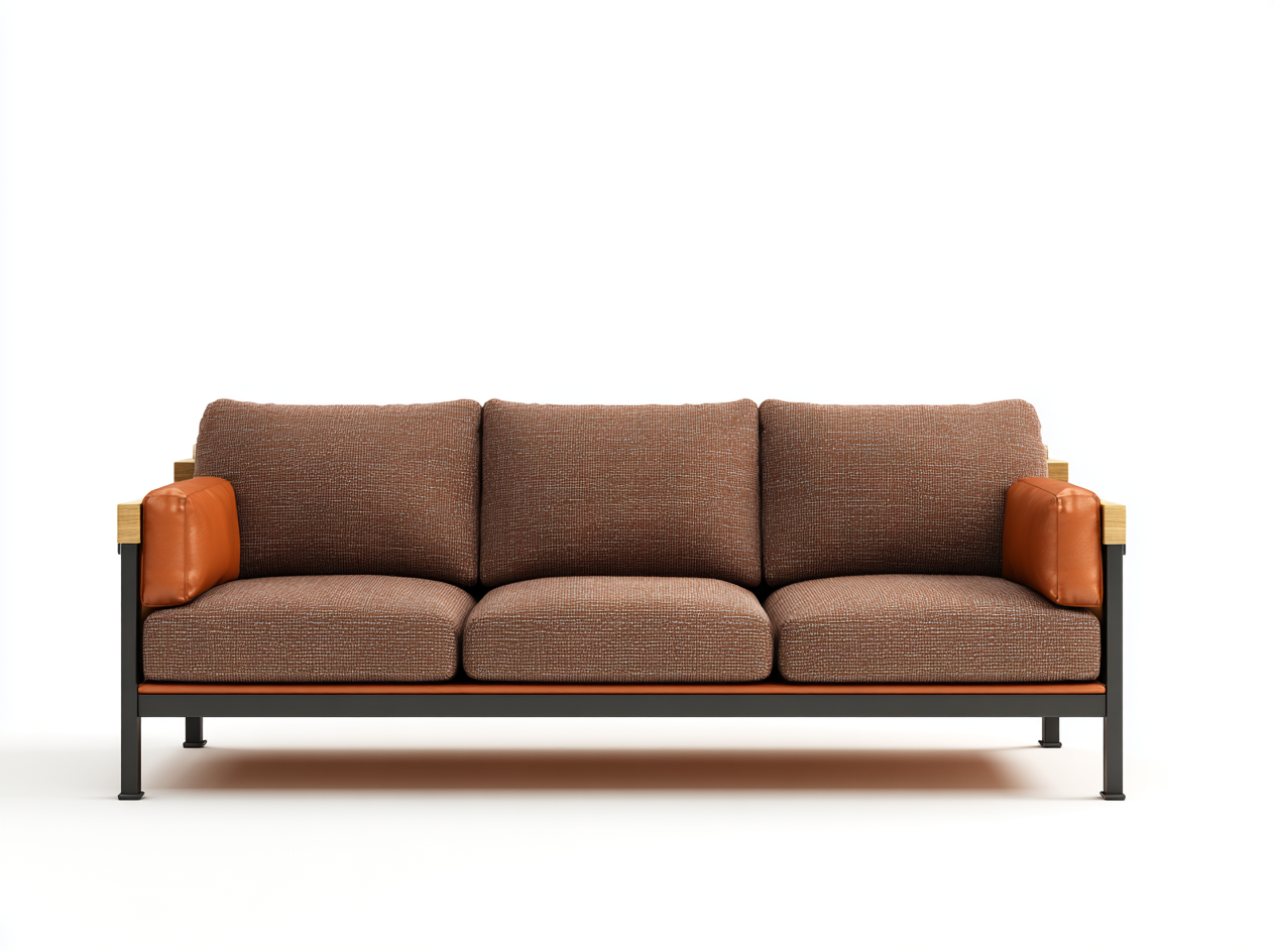 Sofá industrial de 3 plazas en tela marrón con estructura metálica y detalles en cuero