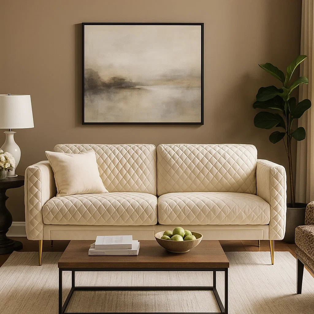 Sofá Moderno Beige Acolchado con Patas Doradas y Cojines Decorativos
