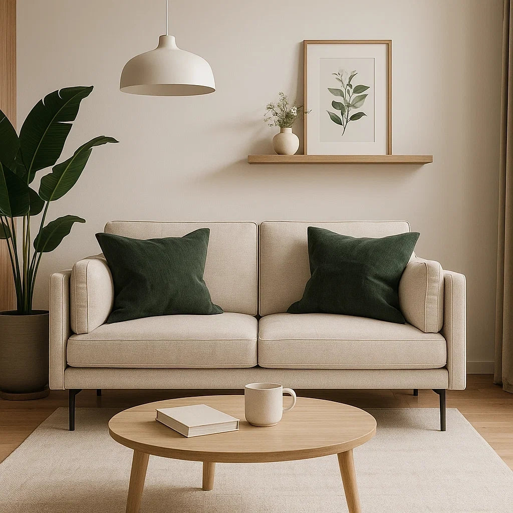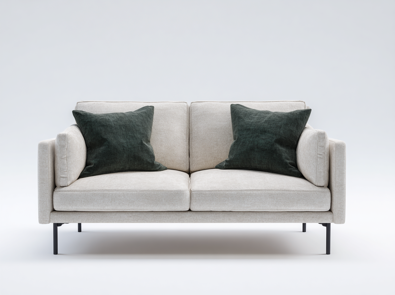 Sofá moderno de 2 plazas en tela beige con cojines verdes y patas metálicas negras