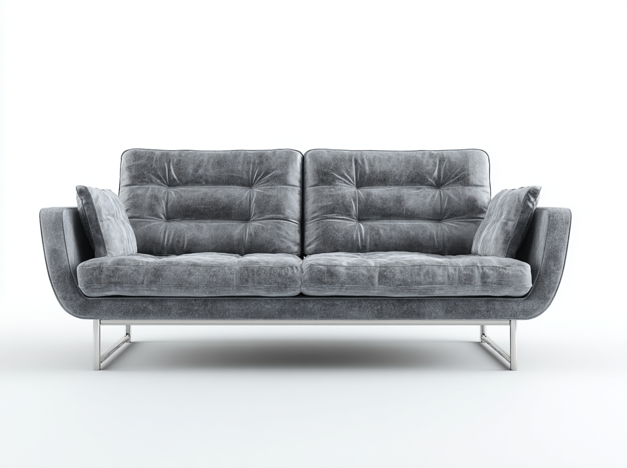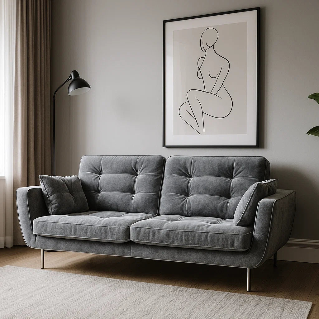 Sofá moderno de 2 plazas tapizado en terciopelo gris con estructura metálica y cojines incluidos