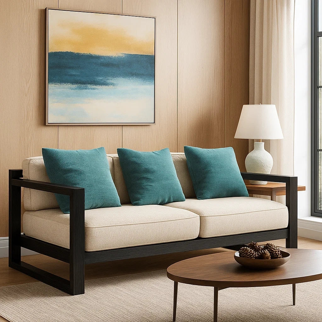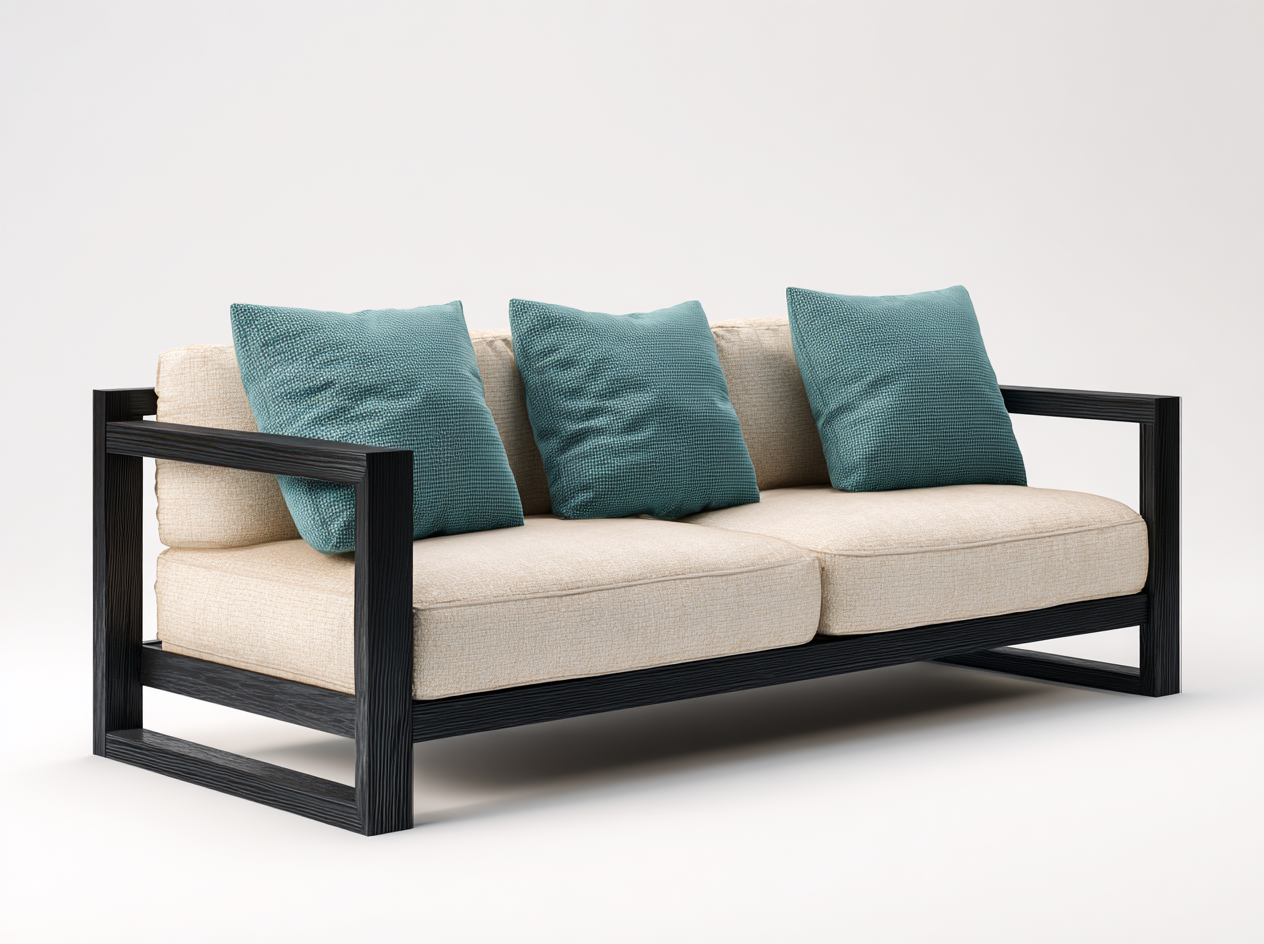 Sofá Moderno de 3 Plazas con Estructura Negra y Cojines Azul Verdoso