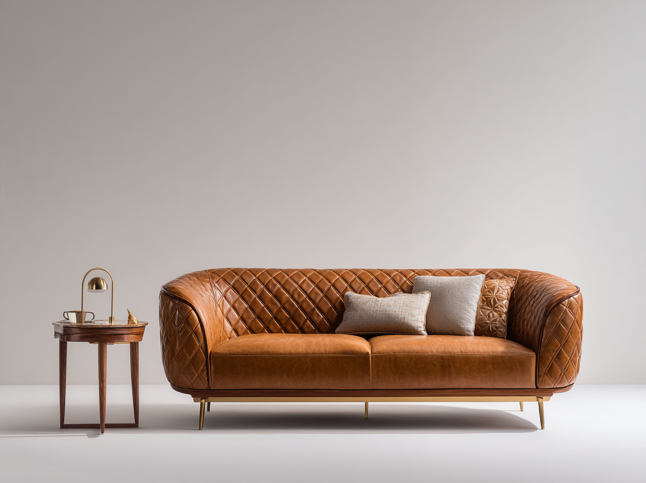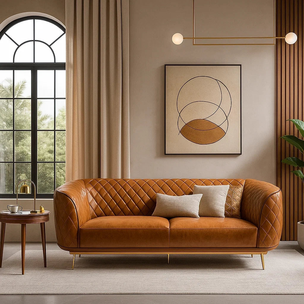 Sofá Moderno de Piel Marrón con Diseño Acolchado en Rombo