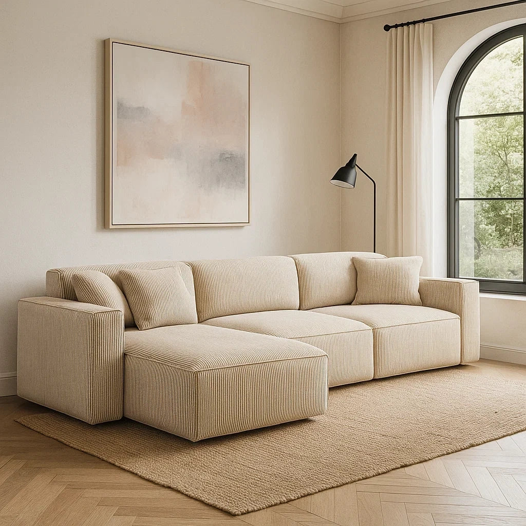 Sofá Modular Esquinero en Chenilla Beige con Reposabrazos
