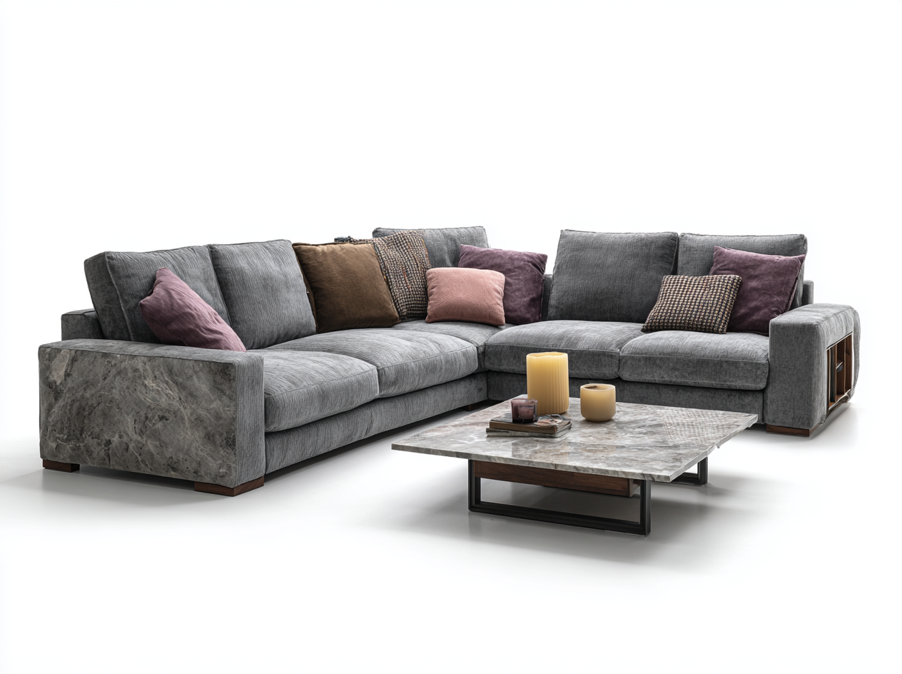 Sofá seccional moderno en L con reposabrazos de mármol y mesa lateral integrada